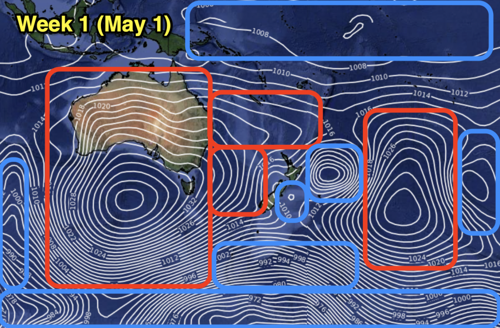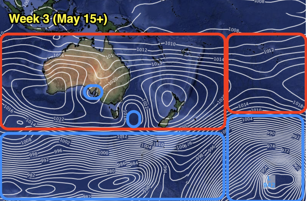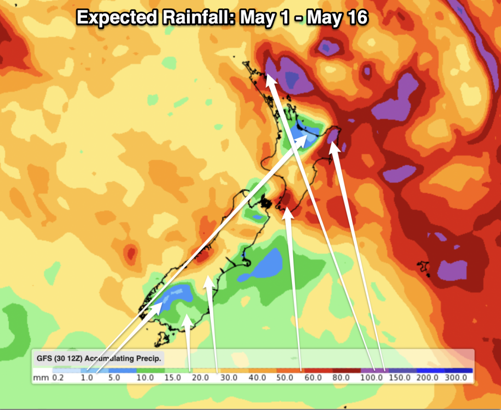 May looks similar to April with some powerful high pressure zones but also a few cold fronts in the mix. The sub-tropics are fairly quiet but the second week of May might see a sub-tropical disturbance that brings some wet weather and windier easterlies to northern NZ (but it’s not locked in due to the powerful high pressure zones coming out of Australia and into southern NZ).