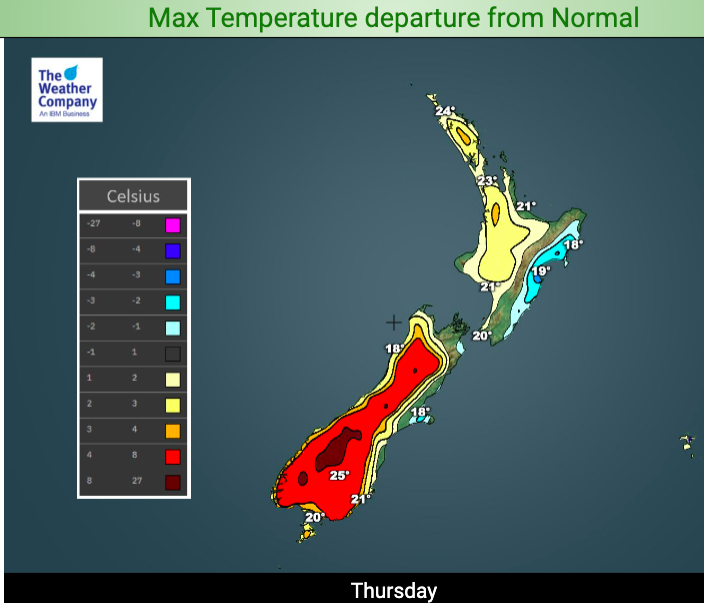 South Island: Most regions, especially towards the south, are warmer than normal by a few to several degrees on Dec 31 but much of Canterbury, Nelson and Marlborough all lean normal with Banks Peninsula even a bit below normal.