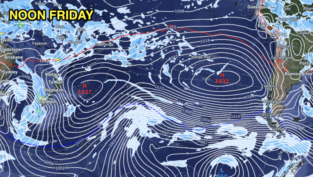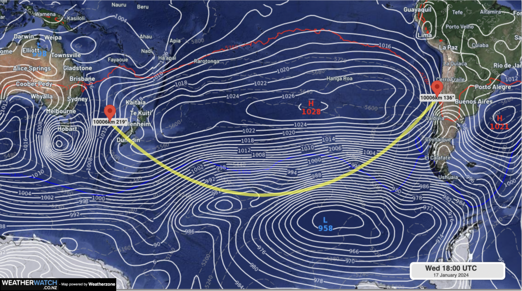 It’s not something you see everyday – in fact, it’s something you may have never seen before. A single high pressure zone (or anticyclone) is currently parked between New Zealand and South America, covering a staggering distance of about 10,000 kilometres (or 6200 miles).