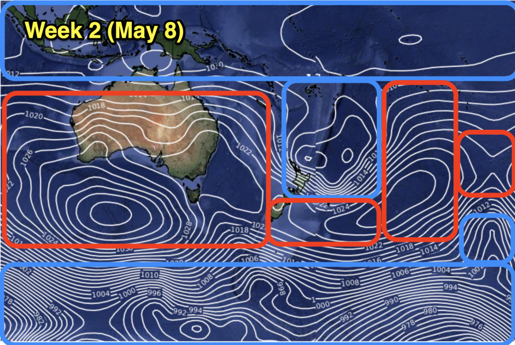 May looks similar to April with some powerful high pressure zones but also a few cold fronts in the mix. The sub-tropics are fairly quiet but the second week of May might see a sub-tropical disturbance that brings some wet weather and windier easterlies to northern NZ (but it’s not locked in due to the powerful high pressure zones coming out of Australia and into southern NZ).