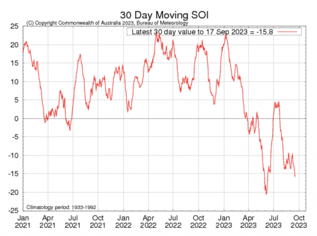 In New Zealand we’ve seen an increase in the usual spring westerlies, spreading out from Australia – but El Niño tightens the screws on that wind, making it stronger than usual and warmer than usual. We saw that this week with the incredible hurricane force winds in the lower eastern North Island on Sunday night and warmer westerlies today and Wednesday nudging NZ’s eastern temperatures to the mid to high 20s C.