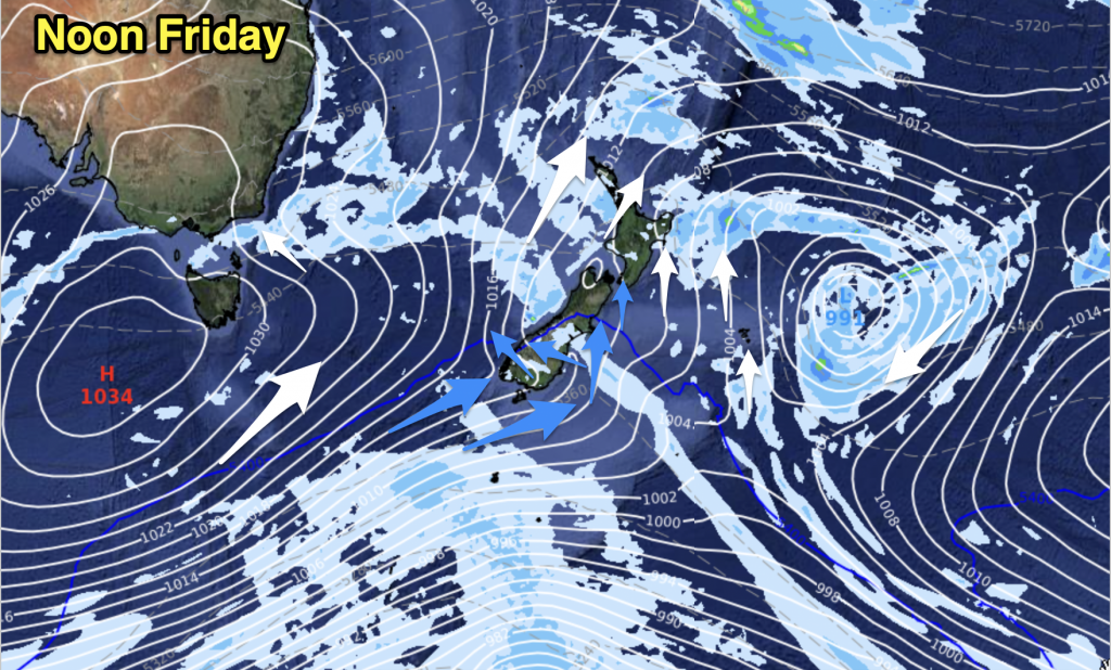 Low pressure lingers for one more day but by Friday it will be clearing eastwards placing NZ between air pressure systems (with the departing low to our east and a powerful high well out to our west near Tasmania).