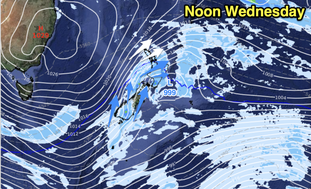 High pressure near Australia is encouraging colder winds into NZ… but by Saturday that high will be anchored near The Far North. This shift in placement of this high pressure zone means the airflow into NZ also shifts later this week. Before that happens we have more southerly quarter winds, which will turn more SW by Thursday and then more NW into Friday and Saturday.