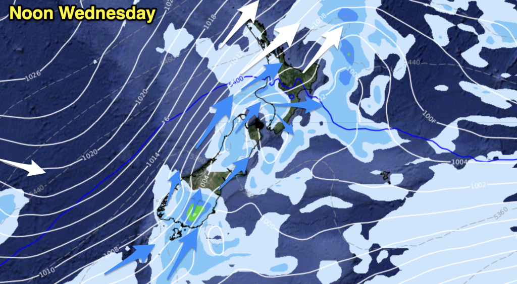 Apologies – we have no weather video today due to travel. Wednesday is a colder and wetter day for northern NZ as a surge of gales and rain/showers moves through. The windy weather is from a straight line “squash zone” between the deepening low pressure zone east of the North Island and the incoming high pressure system to the west.