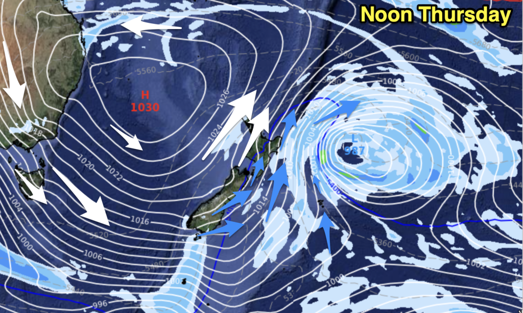 It’s this area of high pressure that has controlled NZ’s weather for the past couple of weeks, being placed near Tasmania – but by Saturday it lies near the Far North and this more northern placement ushers in milder winds for NZ late week and into Saturday.